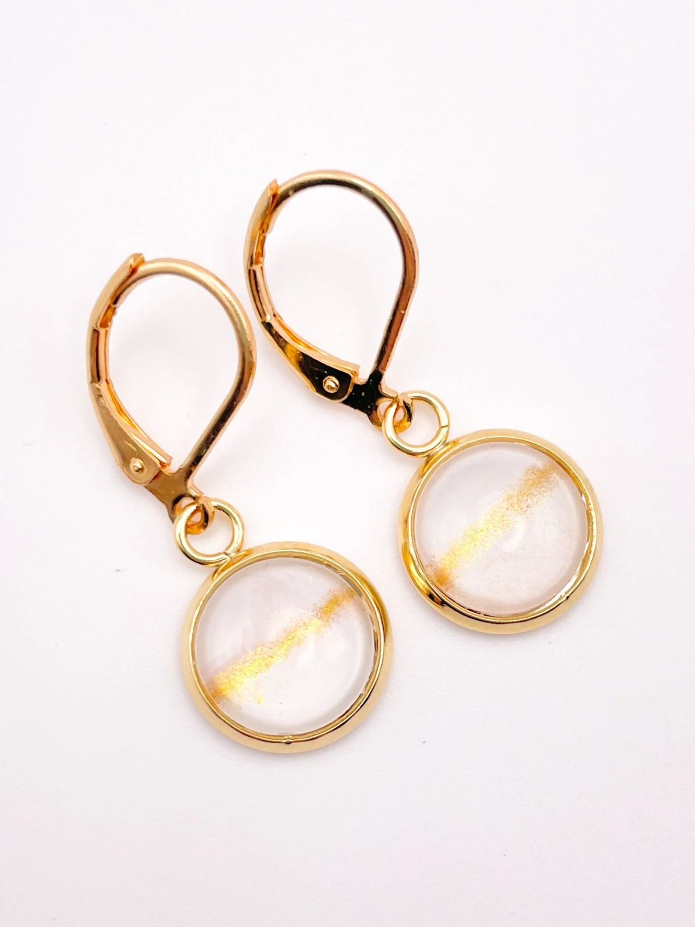 Materials: 24K Gold Plated Stainless Steel French Lever-back hooks, 24K Gold Plated 304 Stainless Steel bezel trays, glass cabochons, acrylic paint