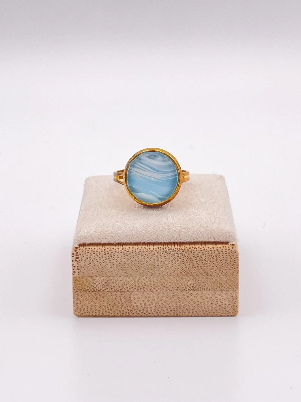 Materials: 12mm round bezel & glass cabochon, adjustable ring in gold-plated stainless steel that fits most adult ring sizes